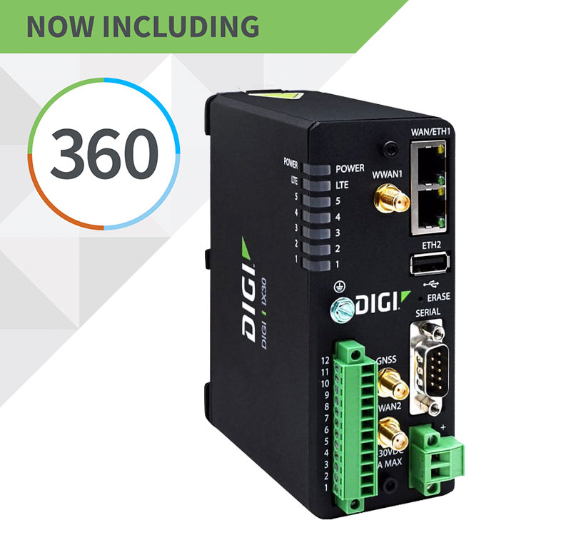Digi IX30 is an intelligent 4G LTE router designed for optimal performance and reliability across a wide range of critical infrastructure and industrial applications. This complete solution is fully integrated with software and security, providing a secure, reliable connection to industrial controllers, process automation equipment and smart grid assets on third party sites or remote locations — easy to deploy and centrally managed via Digi Remote Manager (Digi RM), which is included in your Digi 360 solution.