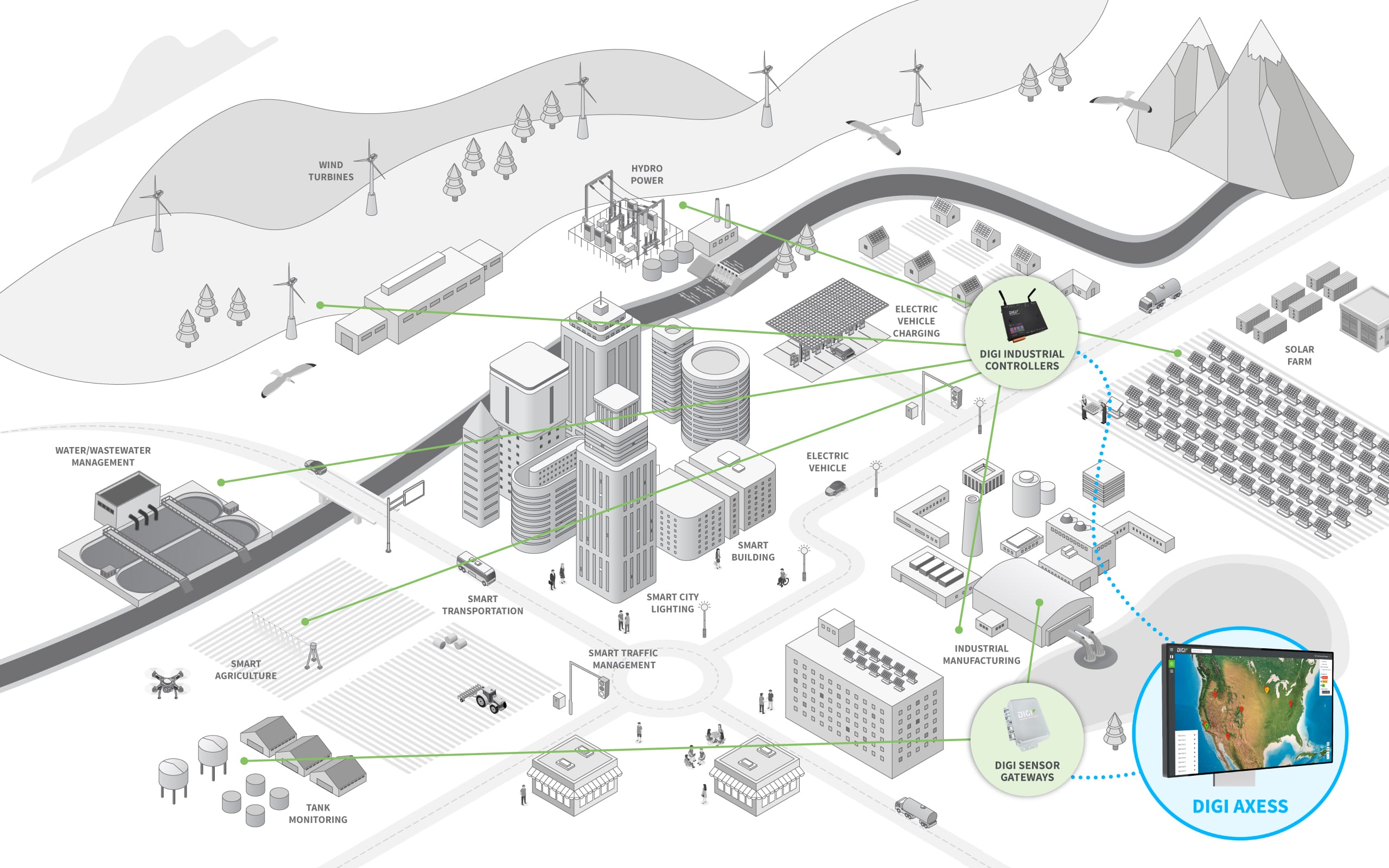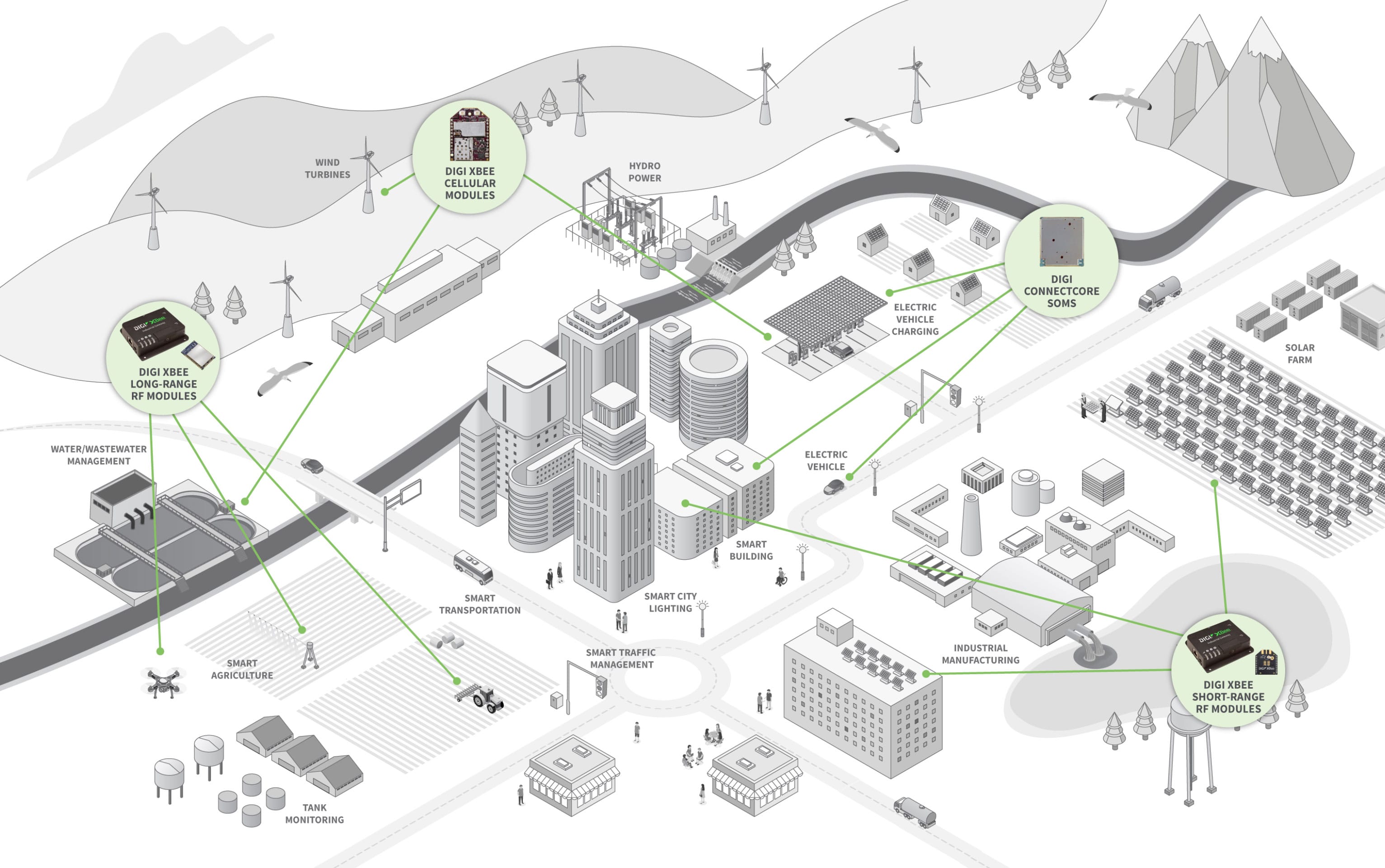 At its core, Green Tech is driven by wireless communications. Solar panels, precision agriculture applications and smart city systems like street lighting and wastewater management systems all require connectivity – for monitoring, management, automation and data insights. Electric vehicles connect to find charging stations. Environmental monitoring systems require connectivity to monitor industrial tank levels and check for water leaks and chemical emissions. Behind it all, Digi wireless connectivity and cellular solutions enable fast, reliable and secure communications and data routing.