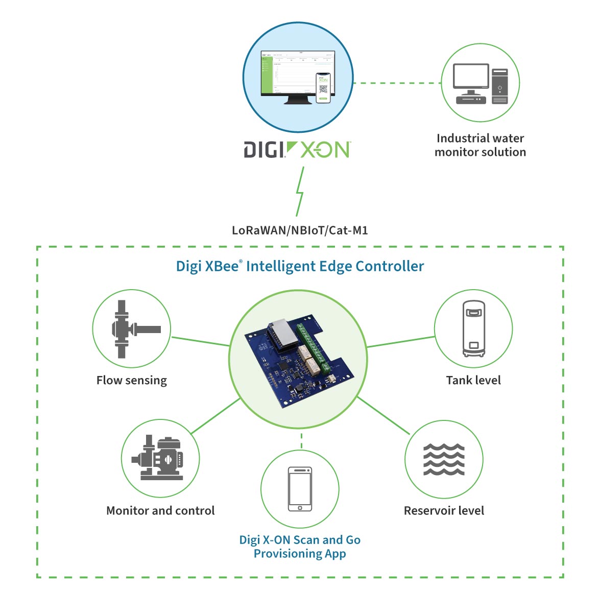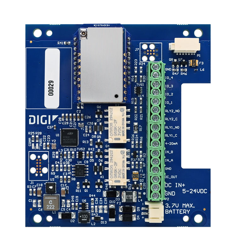 Digi XBee® Intelligent Edge Controller provides a development-ready upgrade to existing industrial sensors with the latest innovation in wireless and cloud technologies. Combine Digi X-ON® IoT platform with Digi XBee Intelligent Edge Controller to monitor sensor or remote-control assets over LoRaWAN™. Industrial devices can be monitored with sub-second accuracy using Modbus RTU or digital or analog I/O. Alarms and data are wirelessly delivered to the Digi X-ON® IoT platform.
