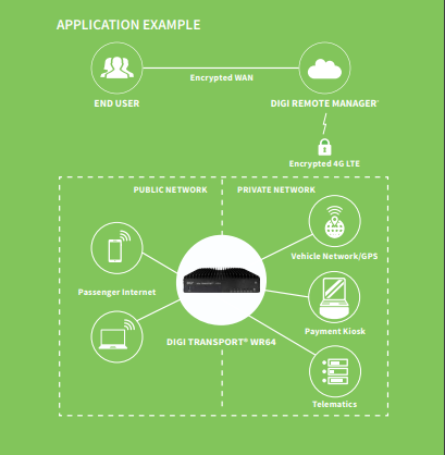 The new Digi TX64 transit router is designed for mission critical communications, with support for priority, pre-emption and failover to backup networks. This is critical for coordinated dispatch and reliable location tracking following an incident when cellular networks may be overloaded, in order to expedite the arrival of emergency response teams. Additionally, multiple transit applications can be combined on a single communication platform. GPS, vehicle tracking, on-board payment systems, ticket kiosks and more can be managed with one router. By consolidating vehicle connectivity, agencies can improve operational efficiency and effectiveness while helping extend the life of transit assets.