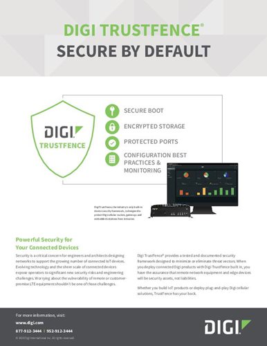 Digi TrustFence provides data authentication and device identity management options. Furthermore, TrustFence ensures that products are not shipped with default user and password settings.